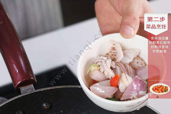 2.锅内放入适量油,油温烧至6成热,放入鱿鱼炸制9秒钟,加入青红椒、洋葱块炸制1秒钟,捞出待用。