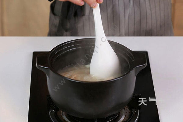 3.放入排骨、姜片、葱段、清水适量煮沸,小火炖1小时,放入竹荪、枸杞继续炖30分钟,放入盐1勺、鸡精半勺即可。
