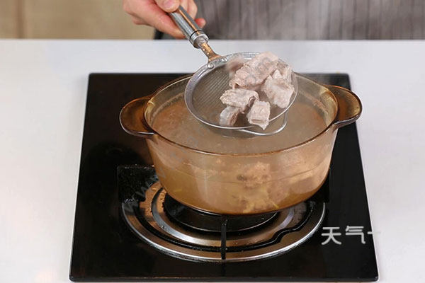 2.排骨放入锅中,加入姜片、料酒1勺、适量清水焯水3分钟,捞出沥干。