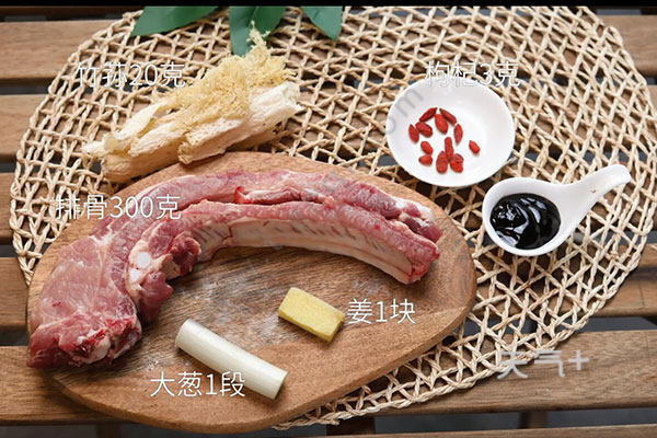 1.竹荪洗净放入温水中,加入盐1勺浸泡1小时,泡好的竹荪剪去根部,排骨洗净,姜切片,大葱切段。