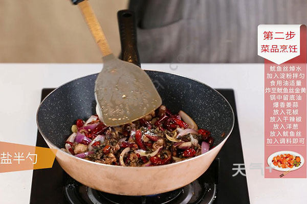 4.锅中留底油,爆香姜蒜,花椒,干辣椒,放入洋葱 鱿鱼丝炒匀,放入盐半勺 ,鸡精半勺,翻炒均匀即可。