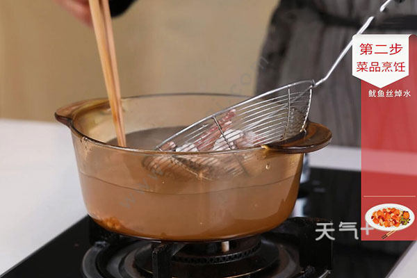 3.油温烧至6成热,放入鱿鱼丝炸至金黄,捞出待用。