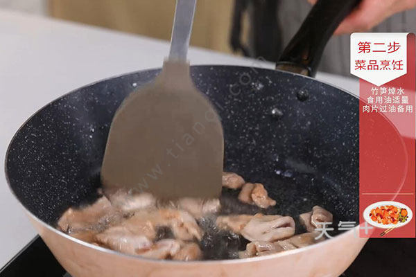4.油温烧至6成热,放入肉片炒至变色,盛出待用;
