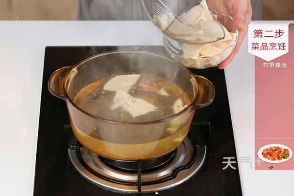 3.竹笋放入沸水中焯水1分钟,捞出沥干;