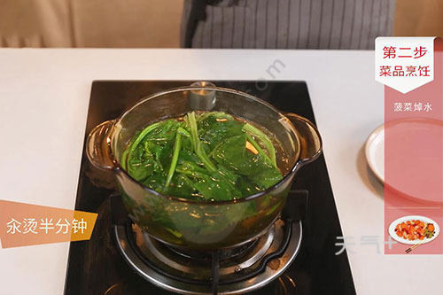 3.菠菜洗净,放入沸水中汆烫半分钟,捞出沥干水份,切碎;