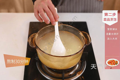 4.锅中倒入适量水,大火烧开,放入大米,煮开后改用小火熬制30分钟,期间不定时搅拌,防止糊锅;