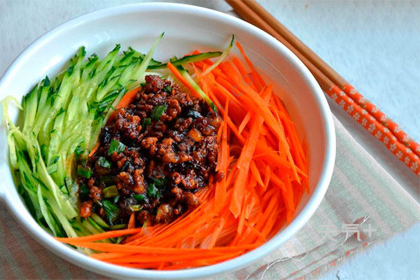 8.煮好的面条盛出,铺在碗底,再加上胡萝卜丝,黄瓜丝和炸好的酱料,拌匀即可。
