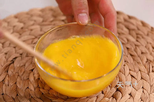 2.将鸡蛋打在碗里,倒入一点点的料酒,打散待用;