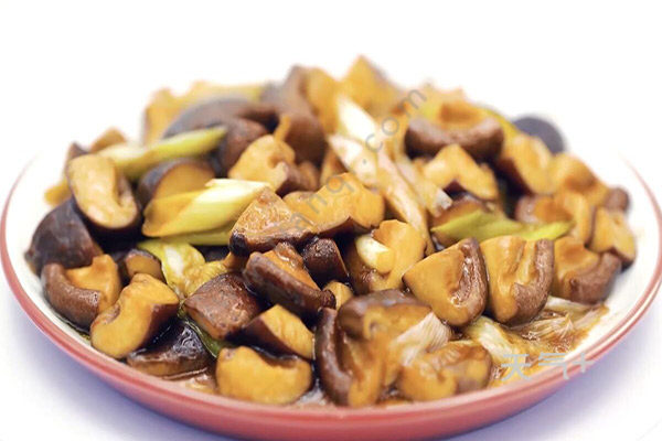 香菇放水中浸泡10分钟,放淀粉,将香菇抓洗片刻后冲洗干净切块,大葱切斜段状备用,锅中放入油,油温烧至7成热,放葱段小火炸香,捞出,放入香菇翻炒2分钟,加入炸好的葱段,放入生抽,耗油半勺,调入半勺盐,翻炒均匀后即可出锅。