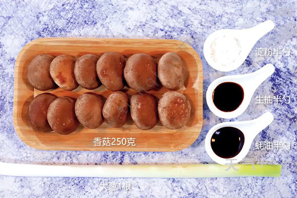 香菇250克,淀粉半勺,生抽半勺,蚝油半勺,大葱1根
