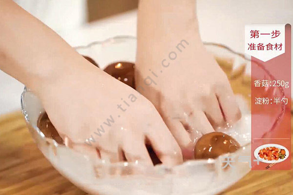 1.香菇放入水中浸泡10分钟,放入淀粉半勺,将香菇抓洗片刻后冲洗干净,切块。