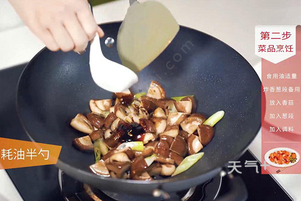3.放入香菇翻炒2分钟,加入炸好的葱段,放入生抽,耗油半勺,调入半勺盐,翻炒均匀后即可出锅。