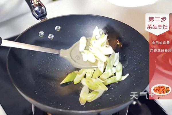 2.大葱1根切斜段状备用,锅中放入适量油,油温烧至7成热,放入葱段,小火炸香后捞出待用。