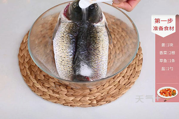 2.草鱼洗净,沿腹部剖开,使鱼能平摊,放入盐1勺、料酒1勺抹匀腌制10分钟;