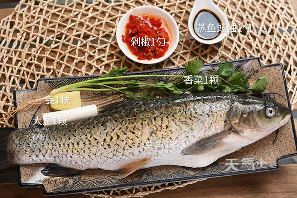 姜切片,香菜切段,草鱼剖开,放盐、料酒腌制10分钟,放锅中蒸3分钟,取出倒掉盘中的水,淋上蒸鱼豉油、小米椒,继续蒸3分钟,取出撒上香菜段,油温烧至7成热,热油淋在鱼身上即可。