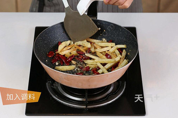 3.锅中留底油,爆香姜蒜末、花椒、干辣椒。放入土豆条,加入盐1勺、鸡精半勺、胡椒粉2克、葱花拌匀盛出即可。
