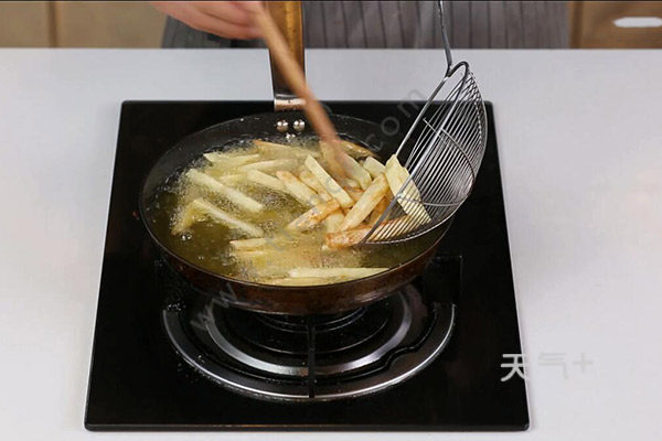 2.油温烧至7成热,放入土豆条炸至酥脆,捞出沥干。