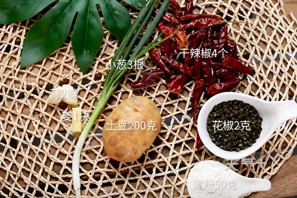 土豆200克,花椒2克,淀粉50克,姜1块,蒜2瓣,小葱3根,干辣椒4个