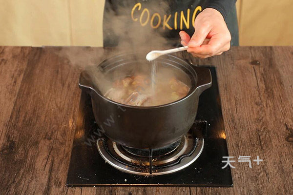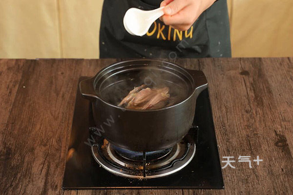 3.鸽子肉煮熟后放入枸杞和盐巴,关火将肉汤舀出,松茸鸽子汤就做好了。