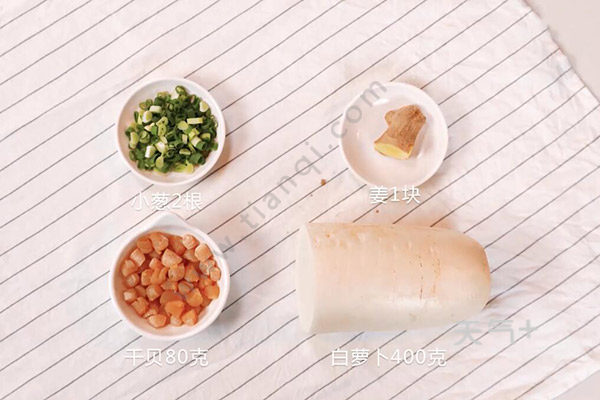 小葱2根、姜1块、干贝80克、白萝卜400克