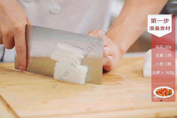 1.干贝用清水浸泡30分钟,姜切末,小葱切葱花,白萝卜切条状。