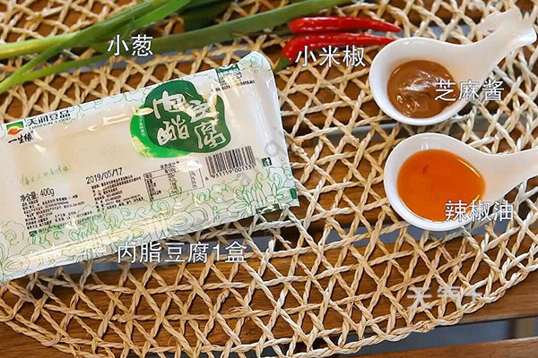 内脂豆腐1盒,小葱3根,小米椒2个,生抽1勺,醋1勺,芝麻酱1勺,辣椒油1勺