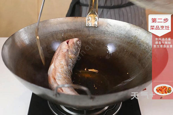 2.锅中放入适量油,油温烧至7成热,放入辣椒段爆香后捞出,放入腌好的草鱼,将鱼煎至两面金黄,捞出沥;