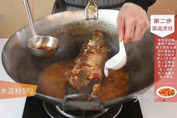 草鱼洗净鱼身划3刀,放盐、料酒、胡椒粉抹匀腌制10分钟,泡椒切碎,干辣椒剪成段,油温烧至7成热,放辣椒段爆香捞出,放草鱼煎至两面金黄捞出,留底油,放泡椒碎、花椒、豆瓣酱、姜蒜末炒香,加生抽、白糖、清水拌匀,放鱼小火焖煮3分钟,放醋,水淀粉勾芡即可。