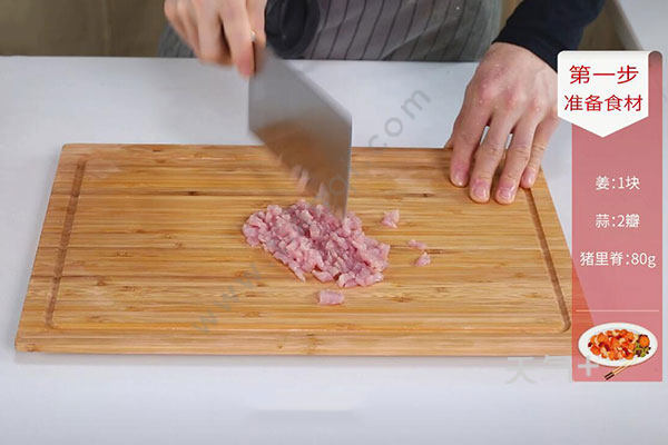 1.姜蒜切末,猪里脊洗净剁成末,放入盐半勺、姜末拌匀腌制10分钟。