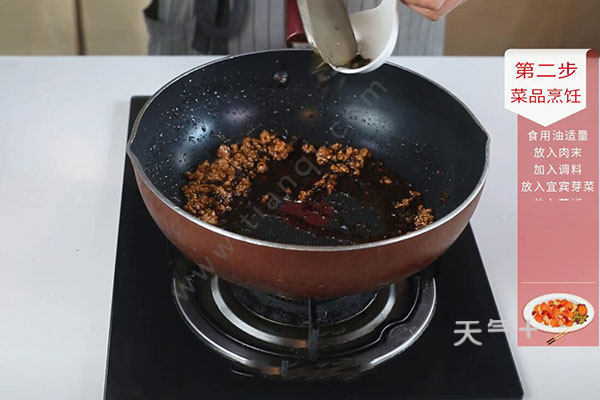 2.锅中放入适量油,油温烧至7成热,放入肉末炒散,倒入料酒1勺、生抽1勺、老抽半勺炒匀,放入宜宾芽菜、花椒炒至肉末微干,盛出待用。