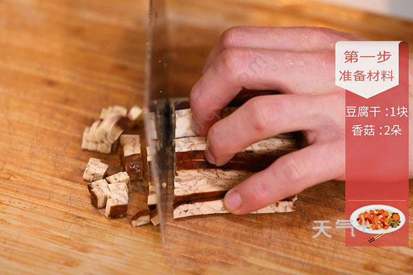 1.豆腐干、香菇洗净切成半厘米见方的小丁,姜葱蒜切末;