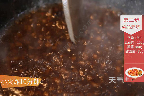 2.锅中倒入适量油,油温烧至7成热,放入八角炒香,加入五花肉煸炒出油,加入黄酱、甜面酱、清水适量拌匀,小火炸10分钟;