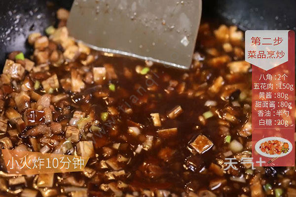豆腐干、香菇切成小丁,姜葱蒜切末,锅中倒入适量油,油温烧至7成热,放八角炒香,加五花肉炒出油,加黄酱、甜面酱、清水拌匀,小火炸10分钟,放豆腐丁、香菇丁、葱姜蒜、香油、白糖2小火炸10分钟即可。