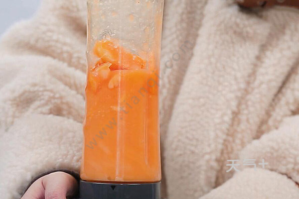 1.先将木瓜对半切开,挖掉中间的果实,然后用勺子把木瓜挖成圆球。把剩下的木瓜榨成木瓜泥。