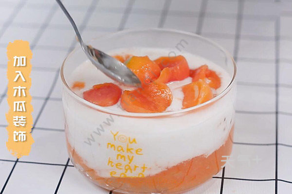 3.碗中加入西米,放入木瓜泥,然后把煮好的椰浆倒入,最后放入木瓜做装饰就好了,这样做出来的木瓜味道鲜美 非常好吃。