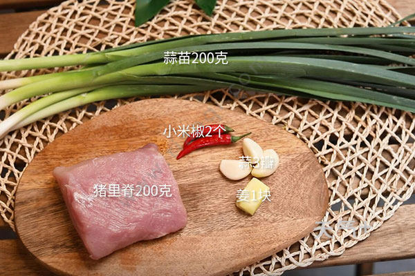 猪里脊200克,蒜苗200克,小米椒2个;