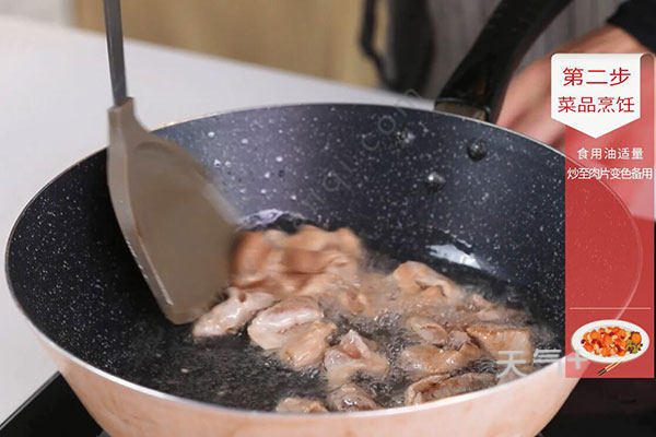 2.蒜苗洗净切段,小米椒切粒,姜切片,蒜切片,油温烧至6成热,放入肉片炒至变色,盛出待用;