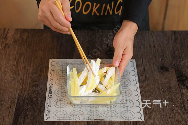 2.之后把土豆条放在纸巾上吸干水份,放入一些淀粉混合均匀。
