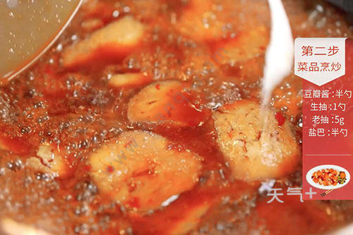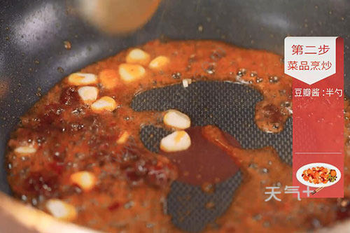 3.锅中留底油,放入豆瓣酱炒出红油,放入蒜片炒匀。加入适量清水、生抽、老抽拌匀;