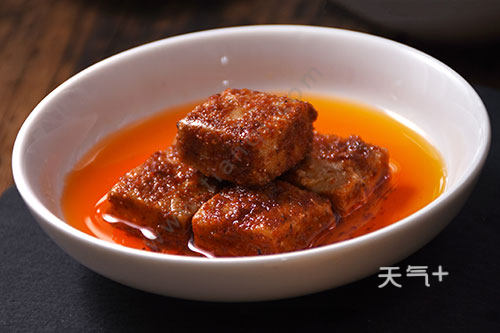 观红豆腐是传统美食,特色鲜明,采用优质的黄豆作为原材料,用酸浆水点制,压榨,切成一寸的大小,常温发酵,加盐、花椒、桂皮等调味料,浸泡后晾干,再加大曲酒和辣椒酱,调制混合,密封。观红豆腐色泽红润,口感松软细腻,味道醇厚,特别适合下饭。