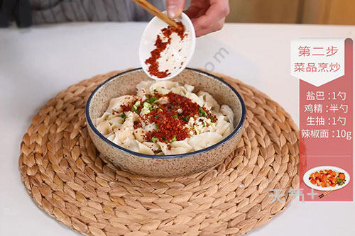 2.锅中加入适量清水煮开,放入面条煮熟,捞出过凉水,放入碗中,放入盐1勺、鸡精半勺、生抽1勺、葱姜蒜末、辣椒面、香油2克;