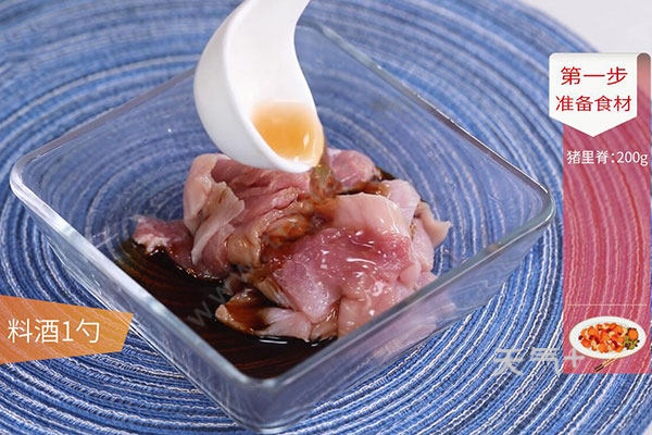 1.猪里脊洗净切小片,放入生抽1勺、料酒1勺、淀粉1勺拌匀腌制10分钟。