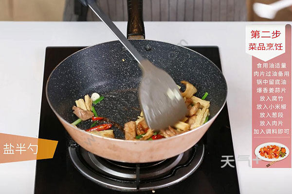 4.锅中留底油,爆香姜蒜片,放入腐竹炒匀,放入小米椒、葱段、肉片翻炒均匀,加入生抽1勺、盐半勺、鸡精半勺、胡椒粉1克炒匀即可。