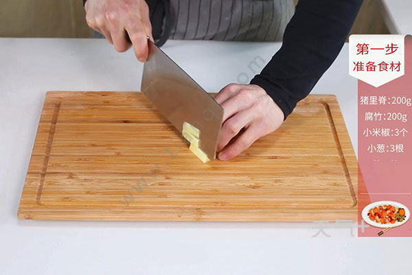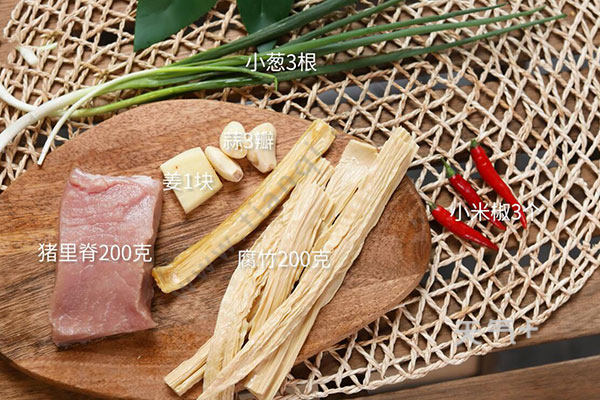 猪里脊切片,放生抽、料酒、淀粉腌制10分钟,腐竹切段,小米椒切段,小葱切段,油温烧至6成热,放肉片炒至变色盛出,留底油,爆香姜蒜片,放腐竹炒匀,放小米椒、葱段、肉片炒匀,加生抽、盐、鸡精、胡椒粉炒匀即可。