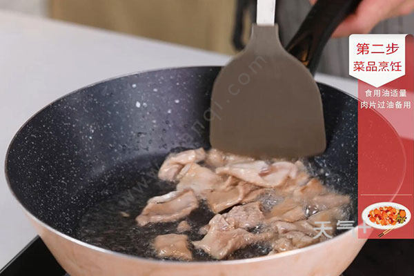 3.油温烧至6成热,放入肉片炒至变色,盛出待用。