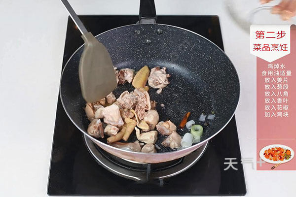 2.大火热油,放入姜片、葱段、八角、花椒、香叶、桂皮炒香,再加入鸡块翻炒,至鸡肉变色;