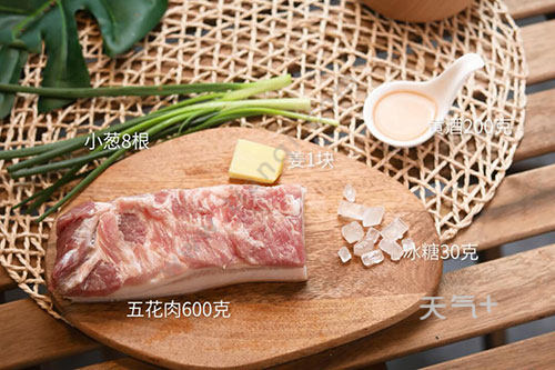 老抽20克,生抽50克,姜1块,小葱8根,冰糖30克,黄酒200克;