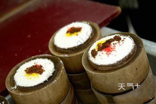 镜糕是很常见的一种西安特色小吃,街头巷尾都可以看到一些做镜糕的小摊贩,镜糕小如镜,像圆圆的镜子,采用的是江米制作而成,把江米研磨成粉,在竹木笼屉里填上江米粉,撒上红糖、绿色和黄色的糖,摞起来蒸熟,待到蒸汽一冲,发出长长的响声就做好了,镜糕好看又好吃。