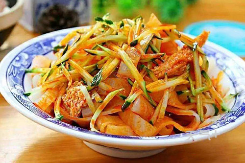 西安街市上面,凉皮是很常见的一种小吃,西安凉皮是到当地一定要吃的。西安凉皮有三种比较有名,岐山擀面皮、汉中热面皮和秦镇米面凉皮。岐山擀面皮是名气最大的,面皮选择最好的材料制作,工艺讲究,面皮白、薄、光、软、筋、香,吃起来凉爽可口,口感筋斗、柔软。