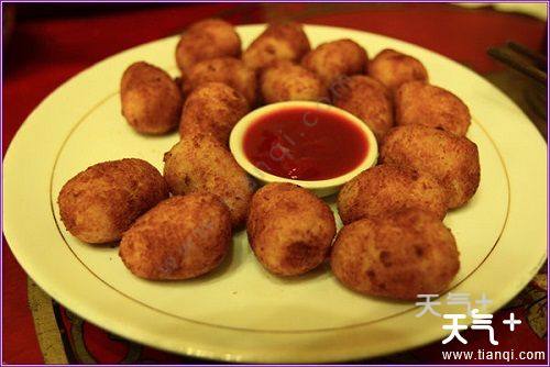 土豆包子就是在土豆泥里面包着牛肉末,外面稍微炸了下,口感酥软。也可以沾蕃茄酱吃。
